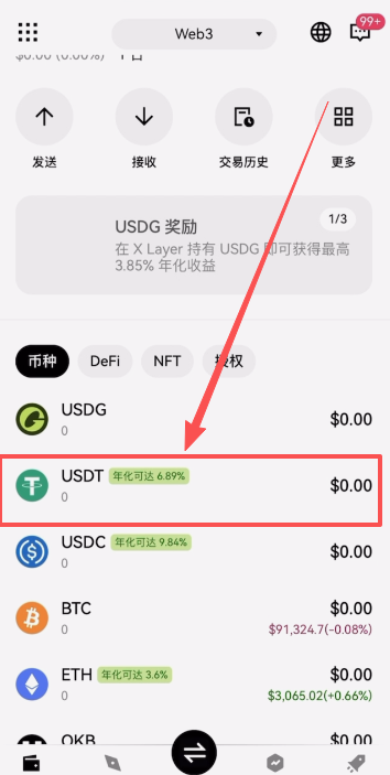 下一步就是要把交易所里面的USDT转到Web3钱包里面了。我们在下方找到USDT这个币种。