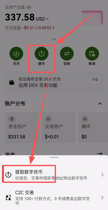 然后我们就可以回到交易所里面,来到资产页面,选择【提币】,点击【提取数字货币】。