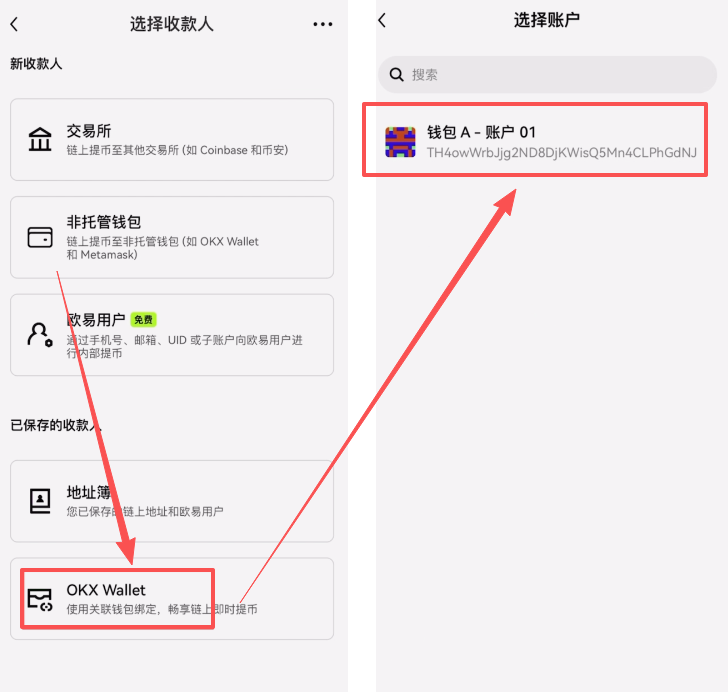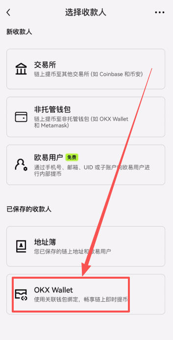 注意看它这里分为“新收款人”和“以保存的收款人”。新收款人指的就是交易所以及一些第三方的钱包,我们要把我们的资产从欧易交易所里面,转到我们的欧易钱包里面,我们用的是已保存的收款人。下方这里有一个OKX Wallet,我们点击。