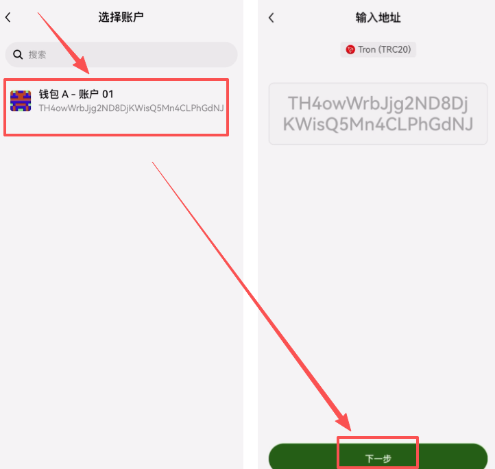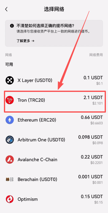 我们刚刚选用的收币地址使用的是TRON TRC20这条链,那我们现在要提币也得选择TRC20这条链。提币和收币的网络必须是一一对应的,否则这个币就会转丢了,我们选择TRON。