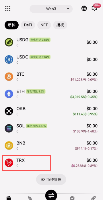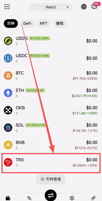 如果没有的话,我们就可以点击“币种管理”,从这里搜索TRX,就可以添加上这个币种。注意不是下方的以太坊链和币安币链的TRX。