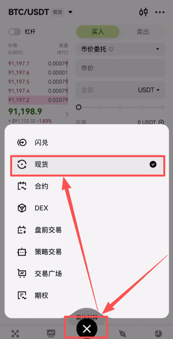 我们回到交易所,如果你的账户里面还没有TRX,我们就可以点击下方中间的【交易】按钮,选择【现货】。