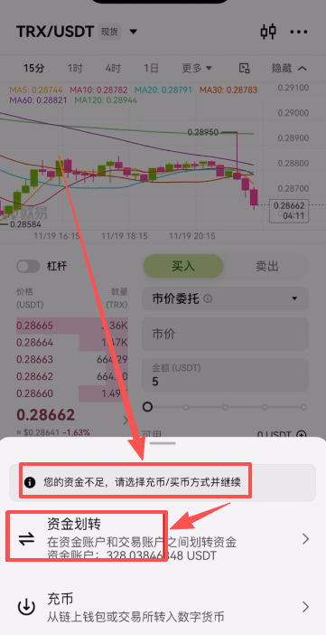 把我们资金账户里面的USDT再划转到交易账户。互转成功之后就可以买入了。