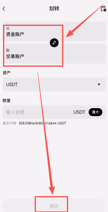 我现在就把我交易账户里面的USDT划转到资金账户,数量选择最大,点击【确定】。这样我们的资产就准备好了。