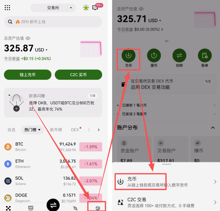 接下来我们再来演示一下怎么把Web3钱包里面的USDT,再转回到欧易交易所。