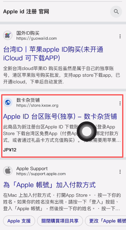 还没有海外apple ID的朋友,可以打开你的Google,在里面搜索“台湾apple id购买”。