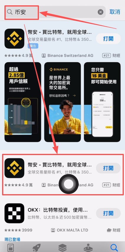 换登完成之后,我们直接搜索“币安”。因为第一个是广告,我们点击第二个下载,就可以下载成功了。