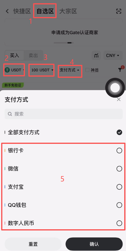 上方选择【自选区】就是个人对个人交易,选择你要购买的币种就是USDT,你可以输入想要购买的金额,然后再选择一个支付方式。可以看到有银行卡、微信、支付宝、QQ钱包、数字人民币都可以选择。