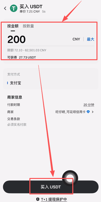 再次输入一下你要购买的金额或者是数量,你会看到它会自动为我们算出来,我们支付200人民币将收到27.23颗USDT。然后你点击下方的【买入USDT】就可以购买成功了。