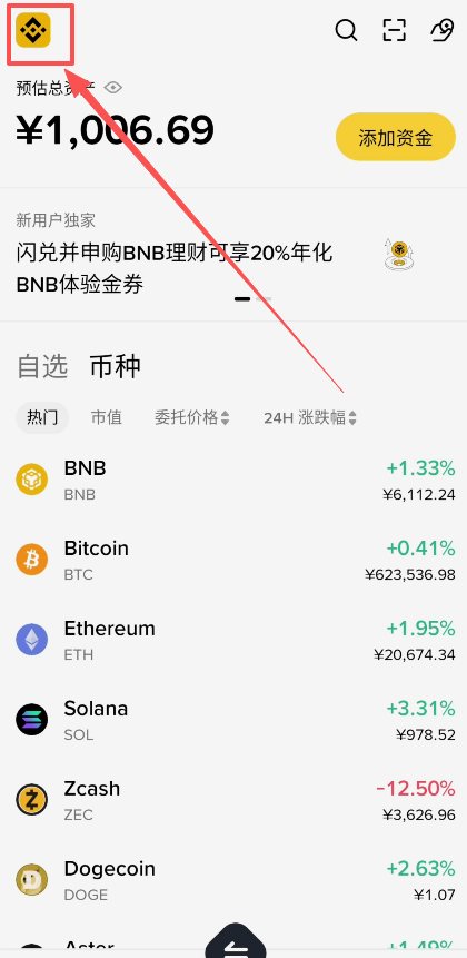 进入币安APP之后,你可能会发现你的页面是下图这样的简易版的页面。这时候就需要我们点击左上角的LOGO。
