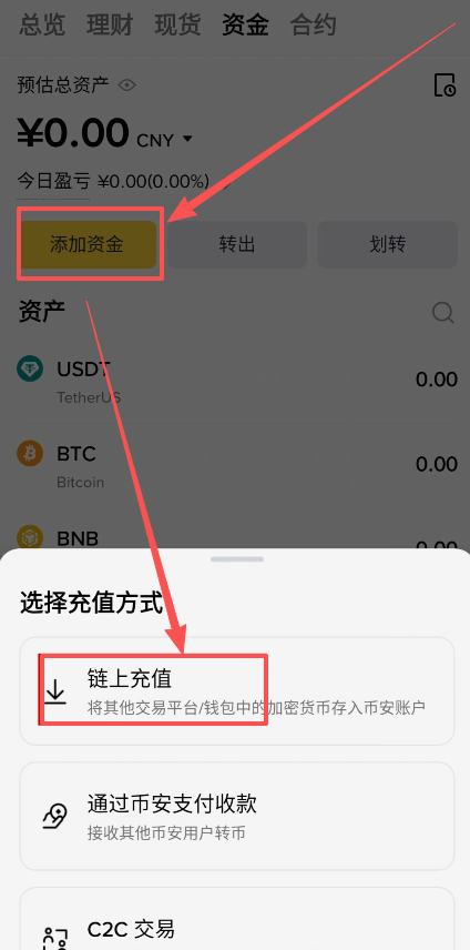 我们在资金账户这里点击【添加资金】。这里有三种充值方式,不过这里的充值指的并不是让我们充值人民币或者是新台币、港币等等。它指的是充值数字货币,我们一般收款或者收币用到的都是USDT这个币种 。我们选择【链上充值】。