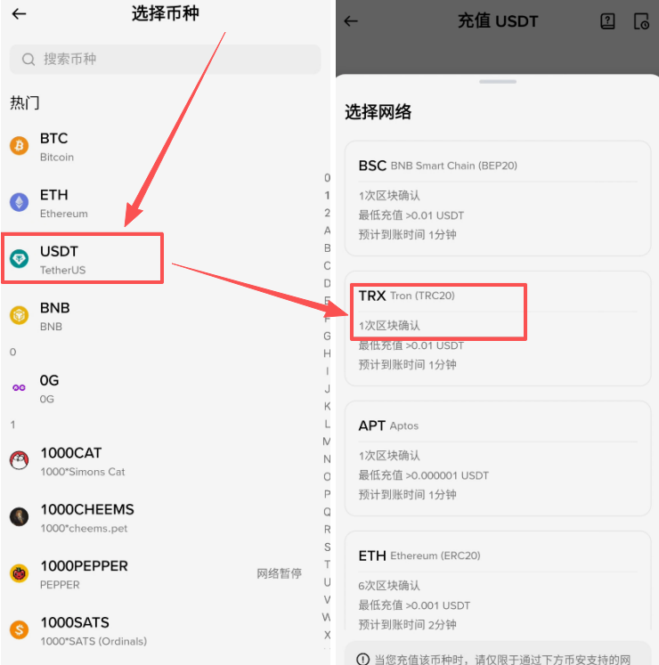 币种选择“USDT”,USDT它是和美元锚定的,也就是在币圈里面每一个USDT都是价值一美元的。这里需要我们选择它的网络,我们一般要选择的是TRC20这个网络,也就是TRX,也叫TRON。