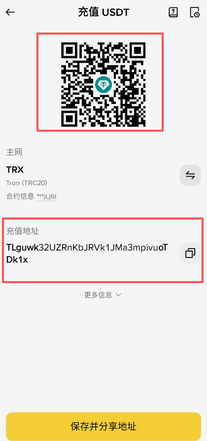这个时候就会出现一个二维码,还有下方的充值地址,是一串乱码。我们可以将这个二维码保存下来,或者是把这个充值地址复制下来给到对方,对方就可以扫码给我们转USDT。也可以将我们的充币地址放到他的提币地址里面,让他提过来。