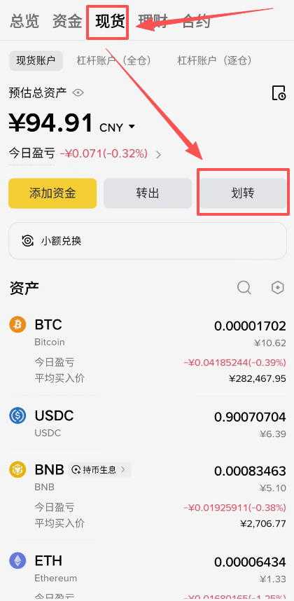 接下来我们就来看一看,你其他账户里面是否还有剩下的USDT。比如说我们来到现货账户里面,点击这里的【划转】。划转就是将USDT在上面的这堆账户里面来回的搬运,就好比把你的货物在几个不同的仓库里面来回搬运一样。它中间是不会收取任何手续费的。