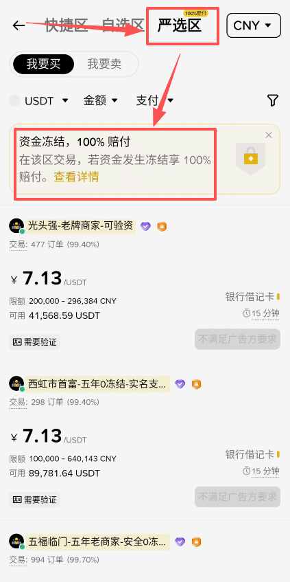 我们就来看“严选区”。严选区这里它给我们一个提示就是,资金冻结是100%赔付的。也就是说严选区的商家,都是在平台压了大量的保证金的,如果你跟他交易一旦出现了问题,被风控被冻结了,他是能够100%的赔付给你的。不过既然是100%的赔付,所以这些商家的要求也会更加高。我们可以往下看,基本上这些商家都是需要验证的,也就是验证我们的身份,查询我们的流水是否正常。