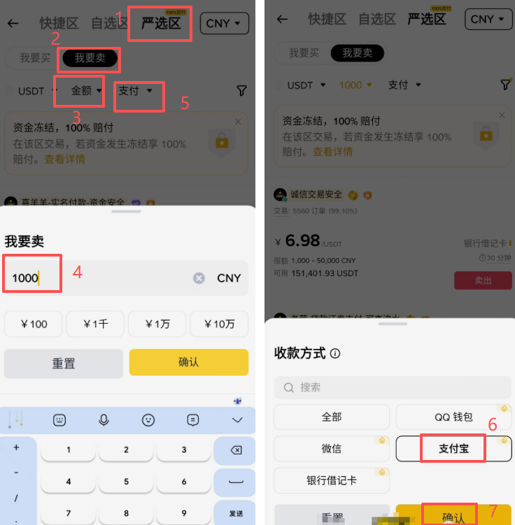 所以我们就回到严选区,选择【我要卖】,在这里进行出金。金额这里我们就可以筛选一下,比如说我想出售1000人民币的USDT。支付方式这里有很多种,微信、支付宝、银行借记卡都是可以的。只不过银行借记卡一旦出现冻结或者风控的问题会比较麻烦。