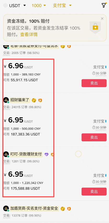 下方这些商家就是符合我们条件的商家了,首先我们看一下它的报价,这里有一个出价6.96的,下方都是6.95的。这里我们就要忽略6.96的商家,选择报价次之的6.95的这些商家。因为我们是要警惕这些高价收U的人的,高价收U别人打给你的钱有可能就是黑钱。而且如果说你不在交易所里面,你跑到社群或者是抖音、微博的评论区里,有一堆人找你说他能高价收你的U,千万不要去找他们,很容易出现问题的,大概率都是黑钱。别人想拿黑钱换你手里干净的USDT,所以他才会高价的去收你的U。