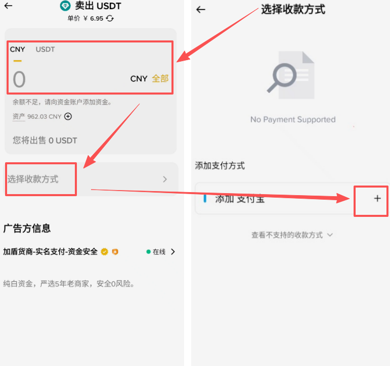 在这里面输入你想要出售的金额,或者USDT的数量,然后添加一下我们的收款方式,点击+号。
