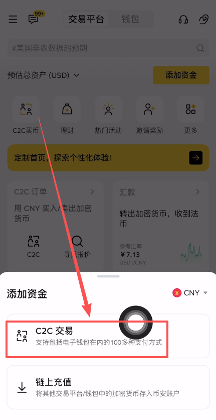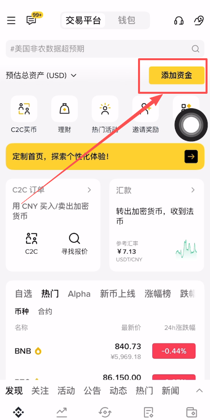 首先,我们进入到币安交易所的首页,点击上方的【添加资金】。