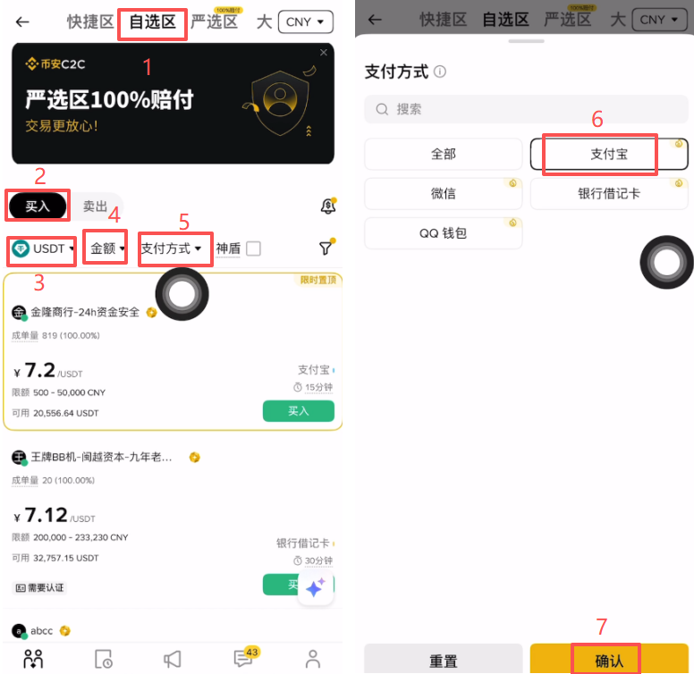 上方我们选择【自选区】,自选区就是个人对个人交易。点击【买入】,选择你要购买的币种,后面也可以筛选一下金额。