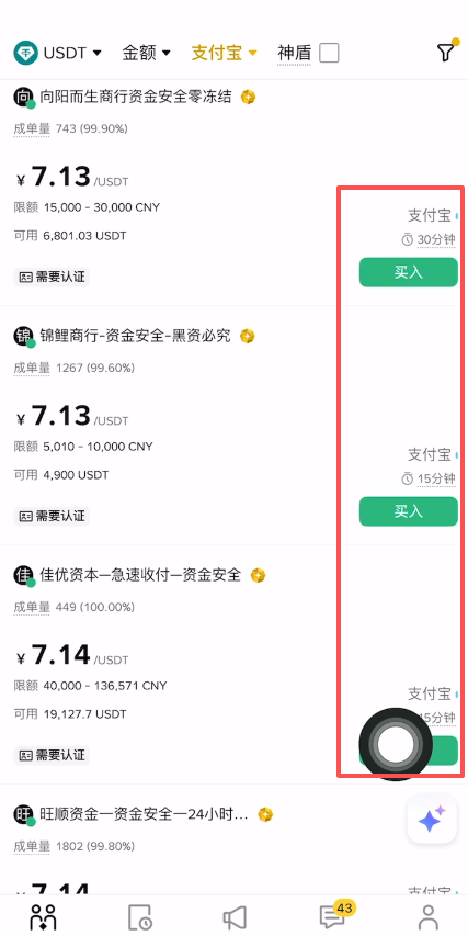 这样币安平台就会为我们筛选出来使用支付宝来支付的商家了,你可以看到商家的后面都支持我们使用支付宝来支付。