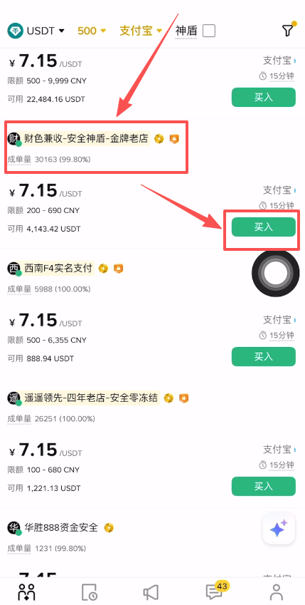 然后你选择成交量和成家率高的商家来进行购买,比如说“财色兼收”这一家,点击【买入】。