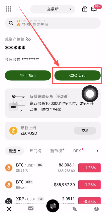 我们打开欧易交易所,打开之后点击上方的【C2C买币】。