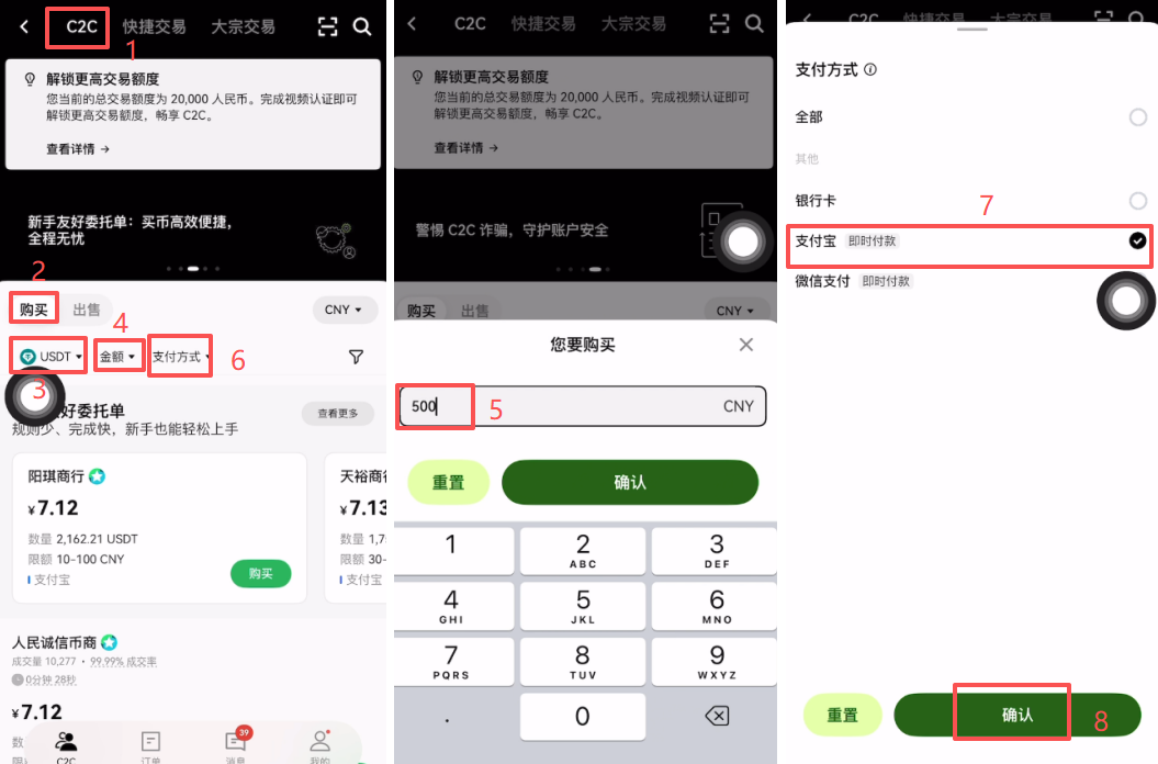 上方选择“C2C”,就是个人对个人交易。选择【购买】,要购买的币种是USDT。