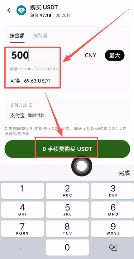 再次输入一下你要购买的金额,可以看到我们支付500人民币将收到69.63颗USDT。点击【0手续费购买USDT】,就可以使用支付宝来进行充值了。