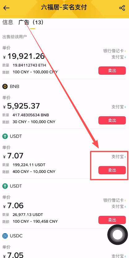 上方选择【自选区】,就是个人对个人交易,是我们可以来选择商家的。然后在上方点击【卖出】,选择要出售的币种是USDT,金额你可以筛选一下要出售的金额,比如说200人民币。支付方式就是我们的收款方式了,比如说我们想使用银行卡来收款,就勾选银行卡,点击【确认】。