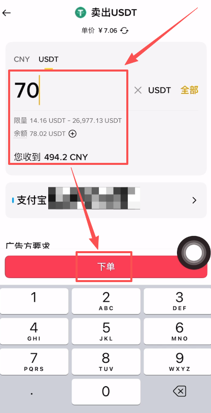 输入一下要出售的数量,比如说70颗USDT。它会为我们算出来我们出售70颗USDT,将收到492.2人民币。然后点击下方的【下单】。