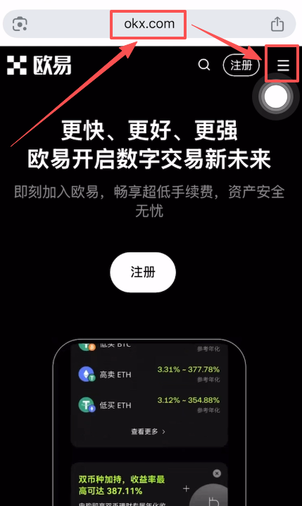 如果你是安卓手机的用户,可以在浏览器里面搜索okx.com,进入到它的官网,点击右上角的三条杠。