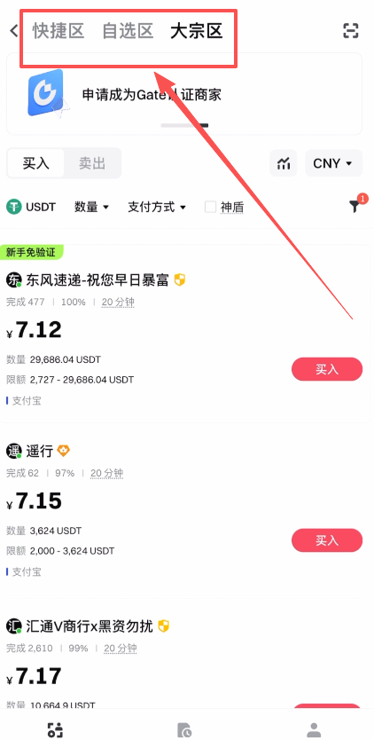 进来之后你可以看到这里分别有快捷区、自选区以及大宗区。自选区和大宗区都是需要我们根据自己的要求,自行去筛选一个商家去交易的。区别就是大宗交易它一般是针对于大额的交易,所以它的限额一般都是比较高的。我们常用的一般就是自选区或者快捷区。