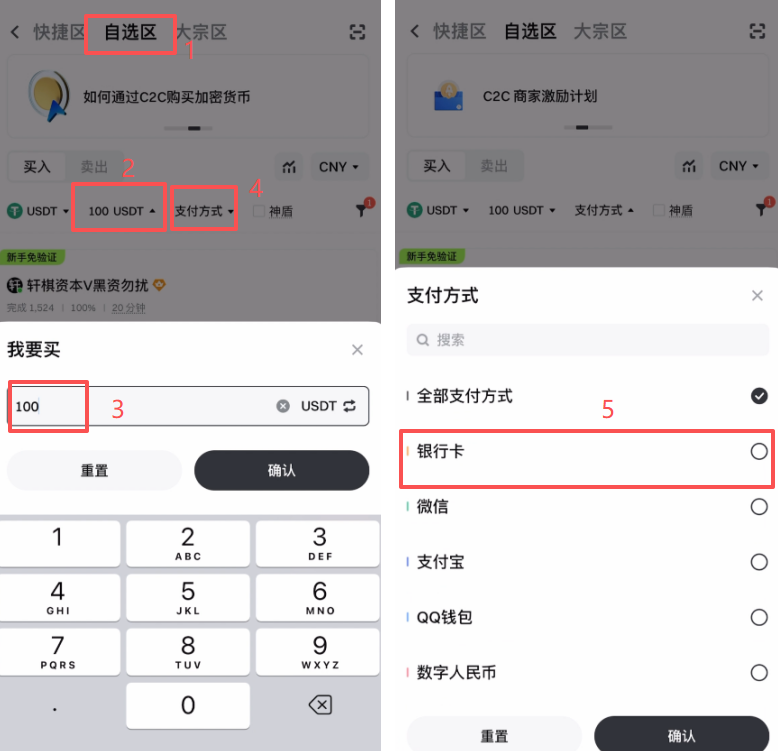 接下来在下方这里就可以筛选一下我们要购买的金额,比如说我这里想购买100个U。支付方式这里我们也可以筛选城银行卡。