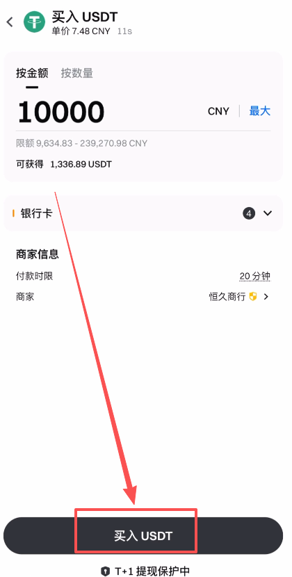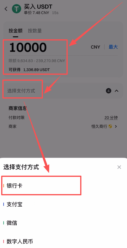 在这里输入进我们要购买的金额或者是USDT的数量,比如说我这里想购买1000人民币的,然后点击下方的“选择支付方式”,我们就可以选择“银行卡”。
