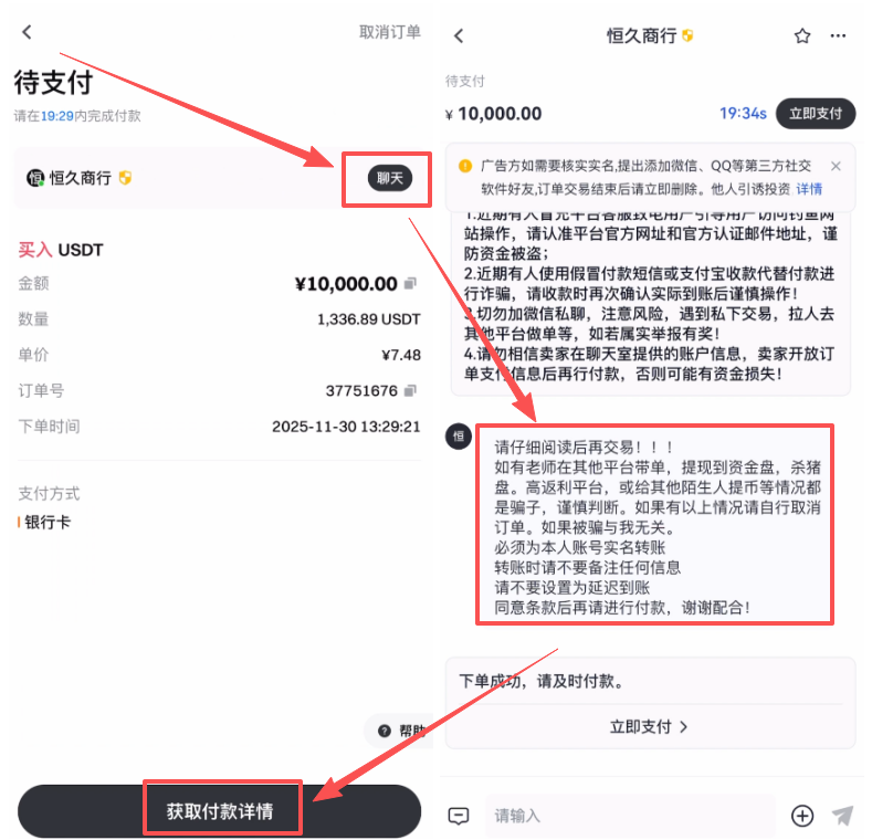 这个时候我们的订单就生成了,我们可以点击【聊天】这里,看看商家有哪些要求。比如说实名付款,不要备注任何信息,不要设置延迟到账。这些都是一些比较基本的要求了,想要让我们的交易顺利进行,就必须按照商家的要求去做,这也是为了我们买卖双方的资产安全。接下来点击【获取付款详情】。