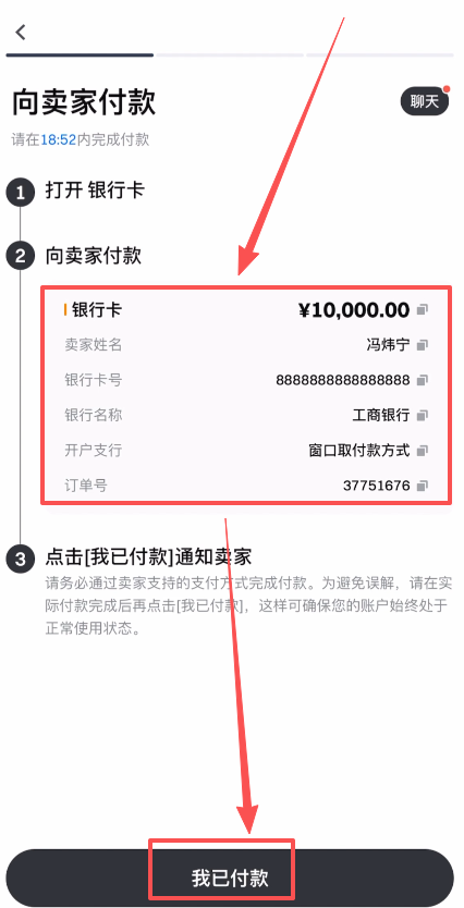 这个时候商家的姓名,还有他的银行卡号、银行名称、开户支行都会在这里面有显示。如果没有的话,我们就可以去到聊天框里面去找商家索取,然后离开平台根据商家提供的信息去给他汇款就可以了。