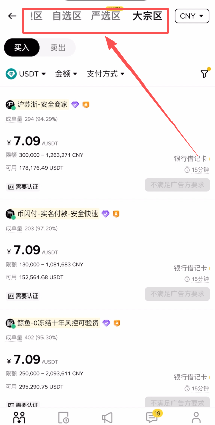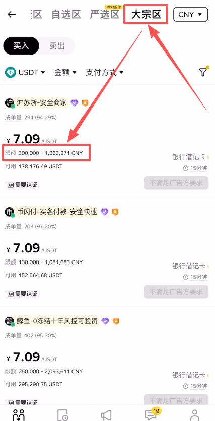 大宗区和严选区以及自选区,这三个区域页面是比较类似的,都是需要我们根据自己的要求,自行去筛选商家。区别是大宗区它一般是针对于大额的交易,可以看到它的限额一般都是比较高的。