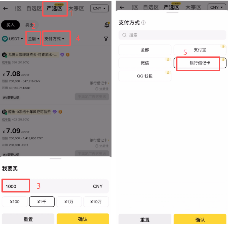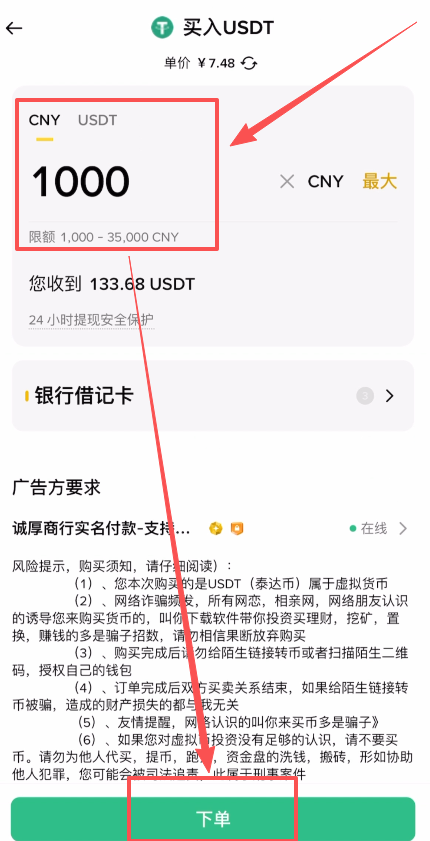 下方的“金额”这里,我们可以筛选一下想要购买的金额,比如说我想购买1000人民币的USDT,支付方式这里我们就可以选择“银行借记卡”。