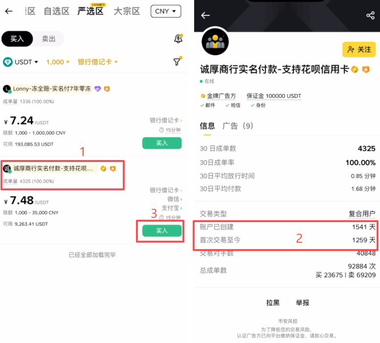 下面出现的就是符合条件的商家,接下来我们就来对比一下。首先要对比他的成单量以及成单率都是越高越好。然后我们需要点开他的主页,查看一下他的账户已创建时间,以及首次交易至今时间,也是要越久越好。因为他的账户存活的时间越久,就证明他的资产越安全。交易了这么长时间以来没有出现过什么问题。确认跟他交易之后,我们就可以点击右边这里的【买入】。