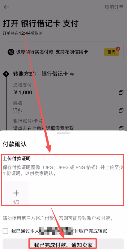然后根据商家提供的银行卡号、银行名称、开户支行以及他的姓名,离开平台私下去给他汇款。汇款完成之后我们回到平台,然后点击【上传付款证明】。