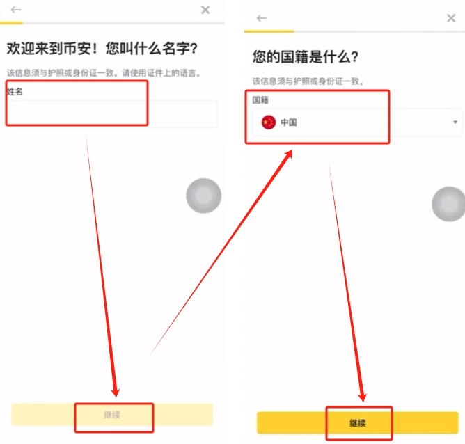 2.填写姓名,点击“继续。再填写一下国籍(中国),再点击“继续”