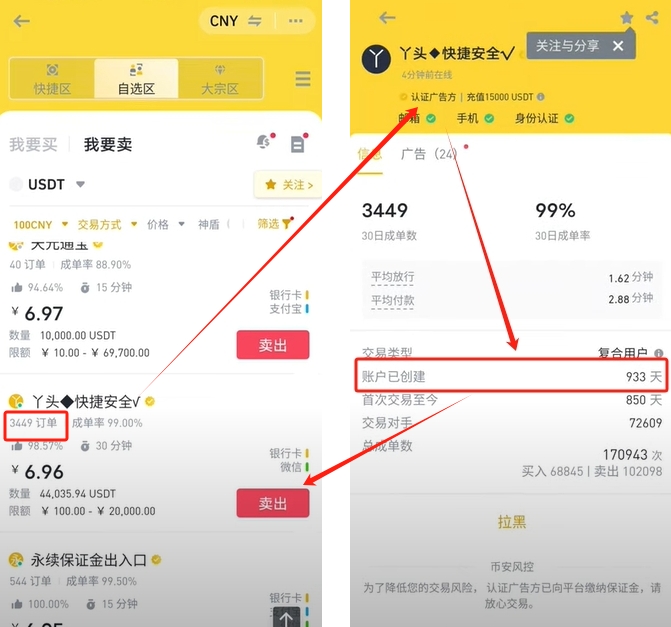 主要来看他的账户已创建的时间。这里显示有933天 。也就是3年了,我们就要找这种创建时间比较久的商家。如果我们确认要跟他进行交易。点击“卖出”
