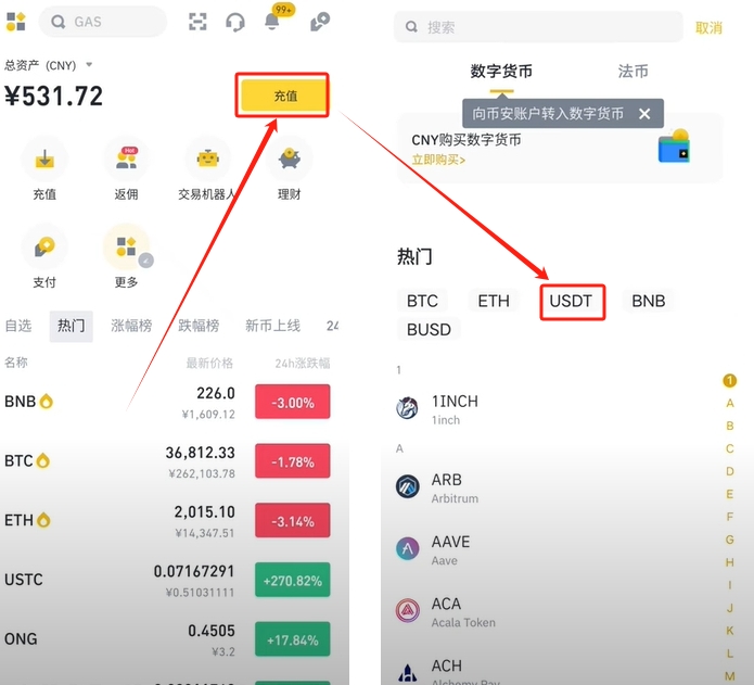 2.或者是你要转给对方,我们就回到币安,点击“充值”,选择“USDT”