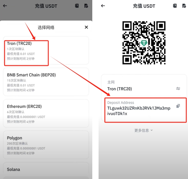 3.我们需要选择一下,它是通过那些链,有各种各样不同的链。有BNB的链、ETH的链。这里用到的最多的就是TRC20,因为它相对来说手续费比较低。每笔交易大概只需要几毛钱。复制地址,也可以把二维码分享给对方。