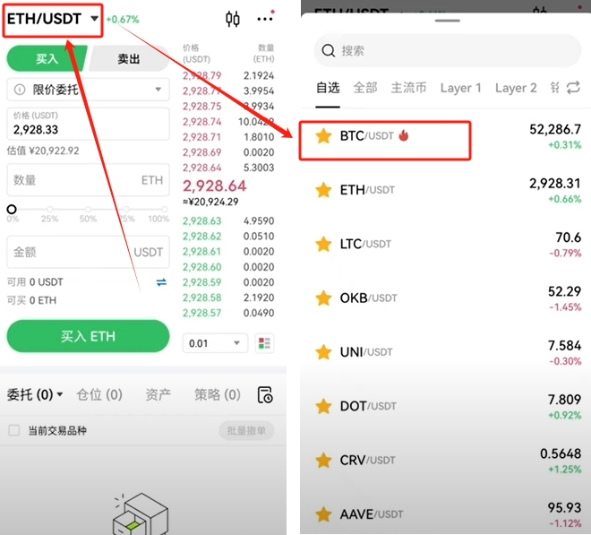 2.左上方选择我们要交易的交易对。比如我们选择BTC/USDT,这个交易对。BTC/USDT指的就是一个比特币和一个泰达币之间的兑换,我们萌购使用斜杠右边的泰达币去买比特币。也能够把斜杠左边的比特币卖成泰达币。