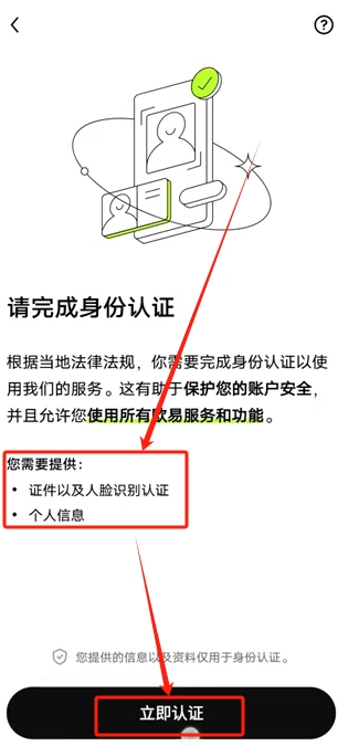 注册完成之后,登录进来。第一件事就是去进行身份认证。如果我们不进行身份认证,是没有办法使用欧易的各种交易功能的。