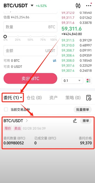 8.比特币有如何把它卖成USDT呢,回到交易,还是币币交易的页面,点击【卖出】。这里还是可以市价卖出,但是我现在不想市价卖出了,那我就可以选择【限价委托】。自己设定一个理想的卖出价格。比如说我想在59370的价格把它卖出,输入想要卖出的数量,点击【卖出BTC】。
