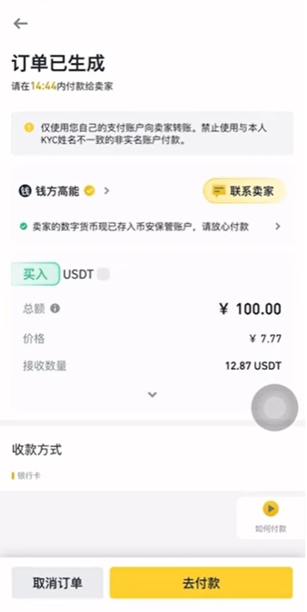 选择一下支付方式,他会告诉我们支付100人民币将收到12.87颗USDT。点击【确认购买】