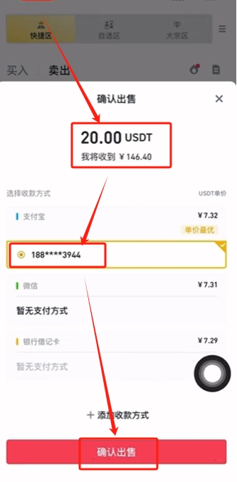 他会告诉我们出售20颗USDT,将收到146.4人民币。然后选择一下收款方式,点击【确认出售】就可以了。然后我们就等待买家给我们打钱,我们收到钱放币给他就行。注意一定要等资金到了自己的银行账户才点击我已经收款。如果自己的银行账户还没收到资金,千万不要惦记我已经收款。否则就可能你的钱没有收到,USDT也没有了。